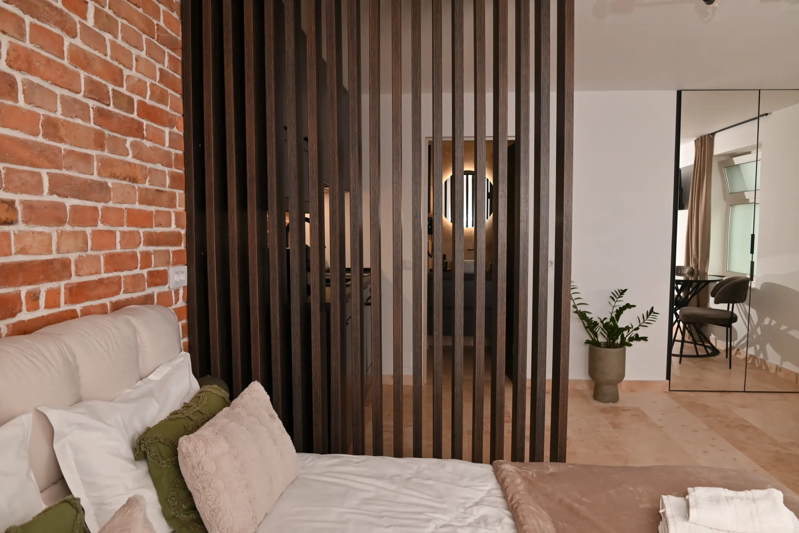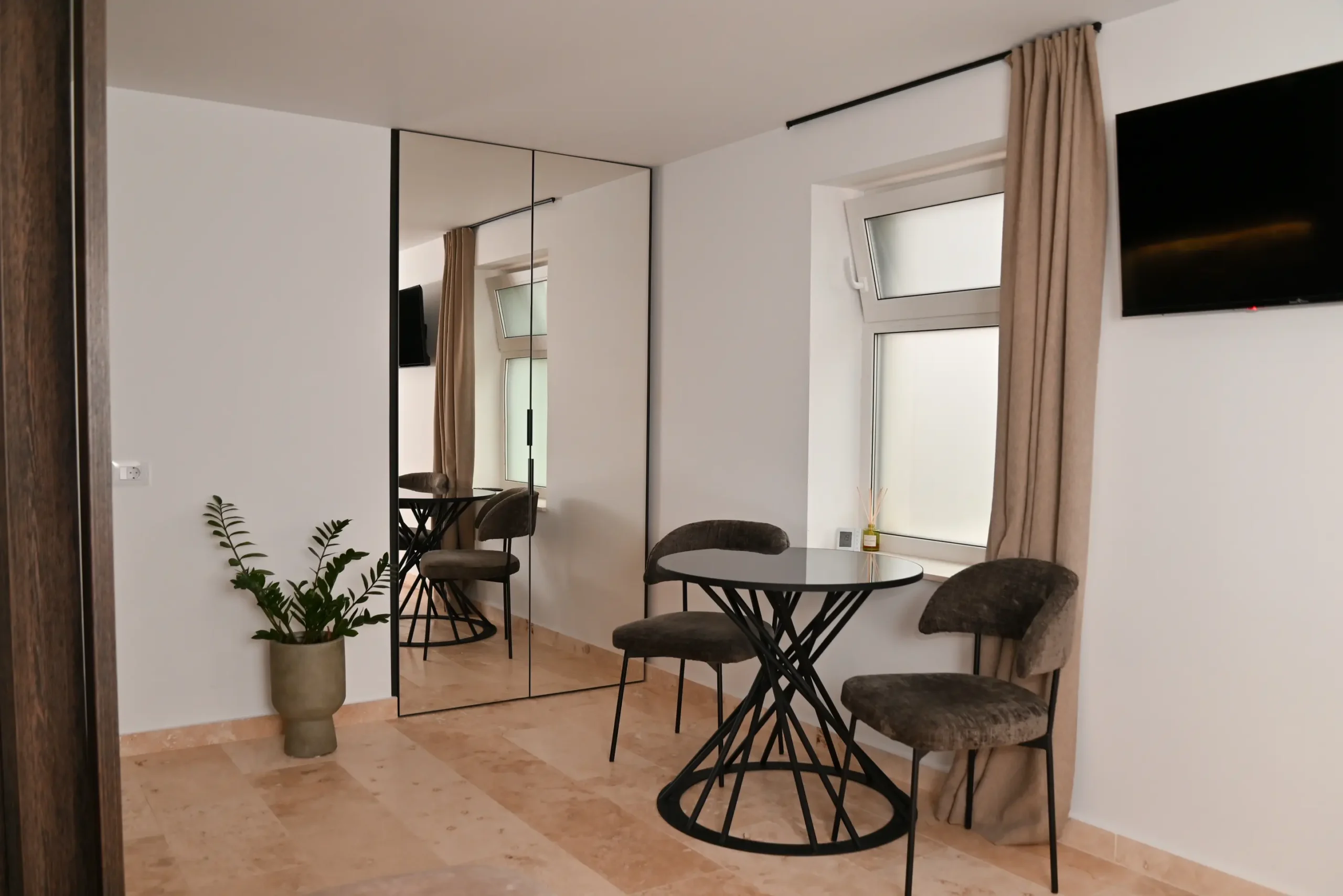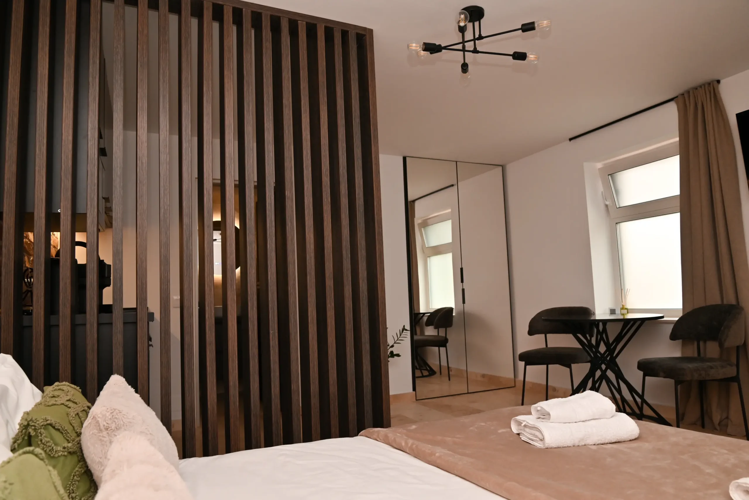 A modern 30 m² apartment featuring a separate bedroom, a fully equipped kitchenette, and a private bathroom with a walk-in shower. You can enjoy a terrace overlooking the inner courtyard, air conditioning, a washing machine, and a TV with streaming services. Perfect for a relaxing stay in Cluj, with all the amenities you need right at your fingertips.