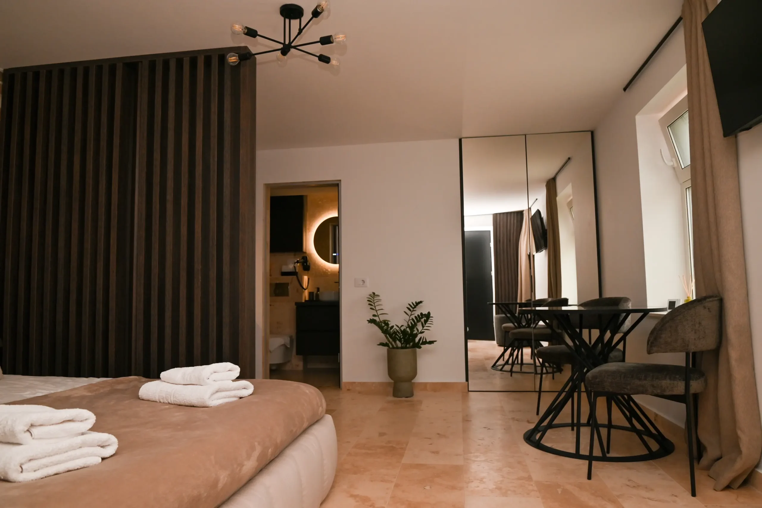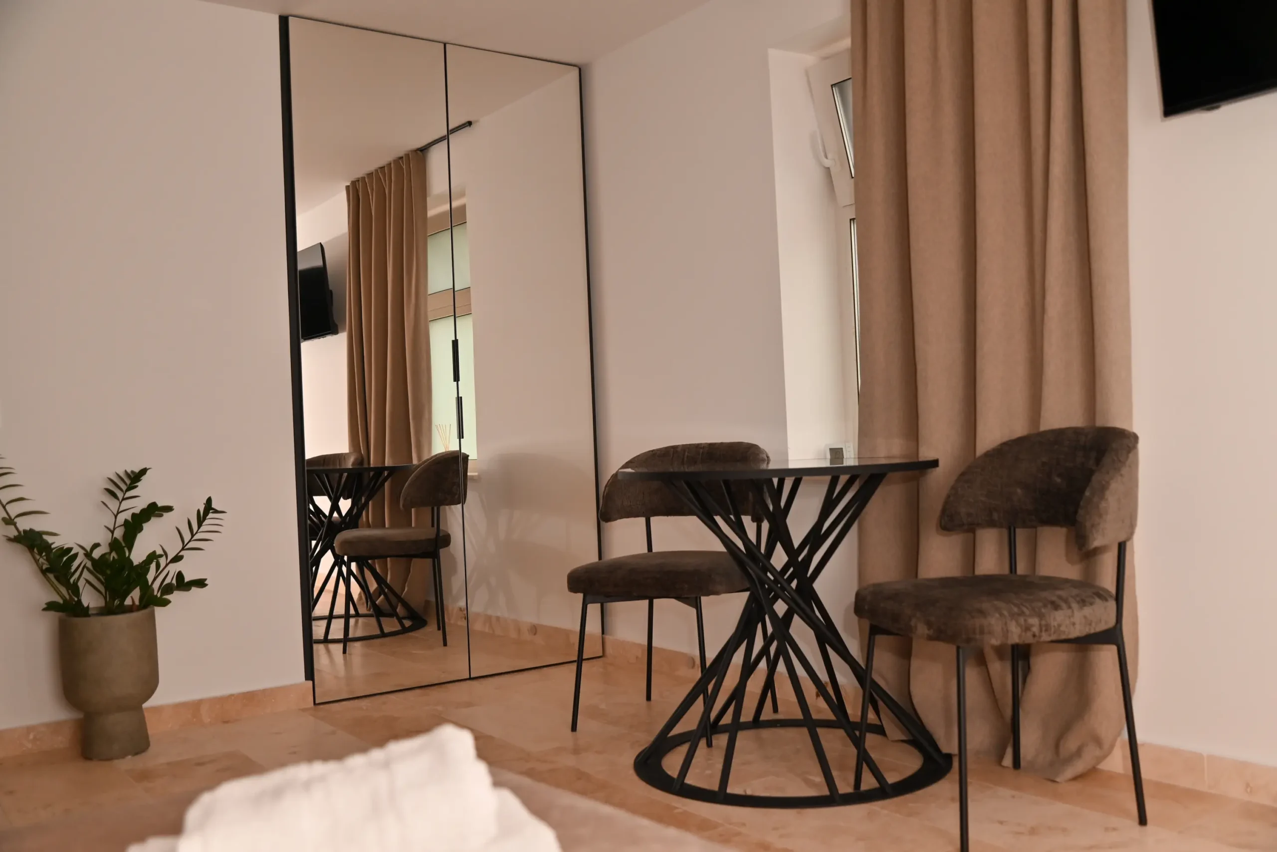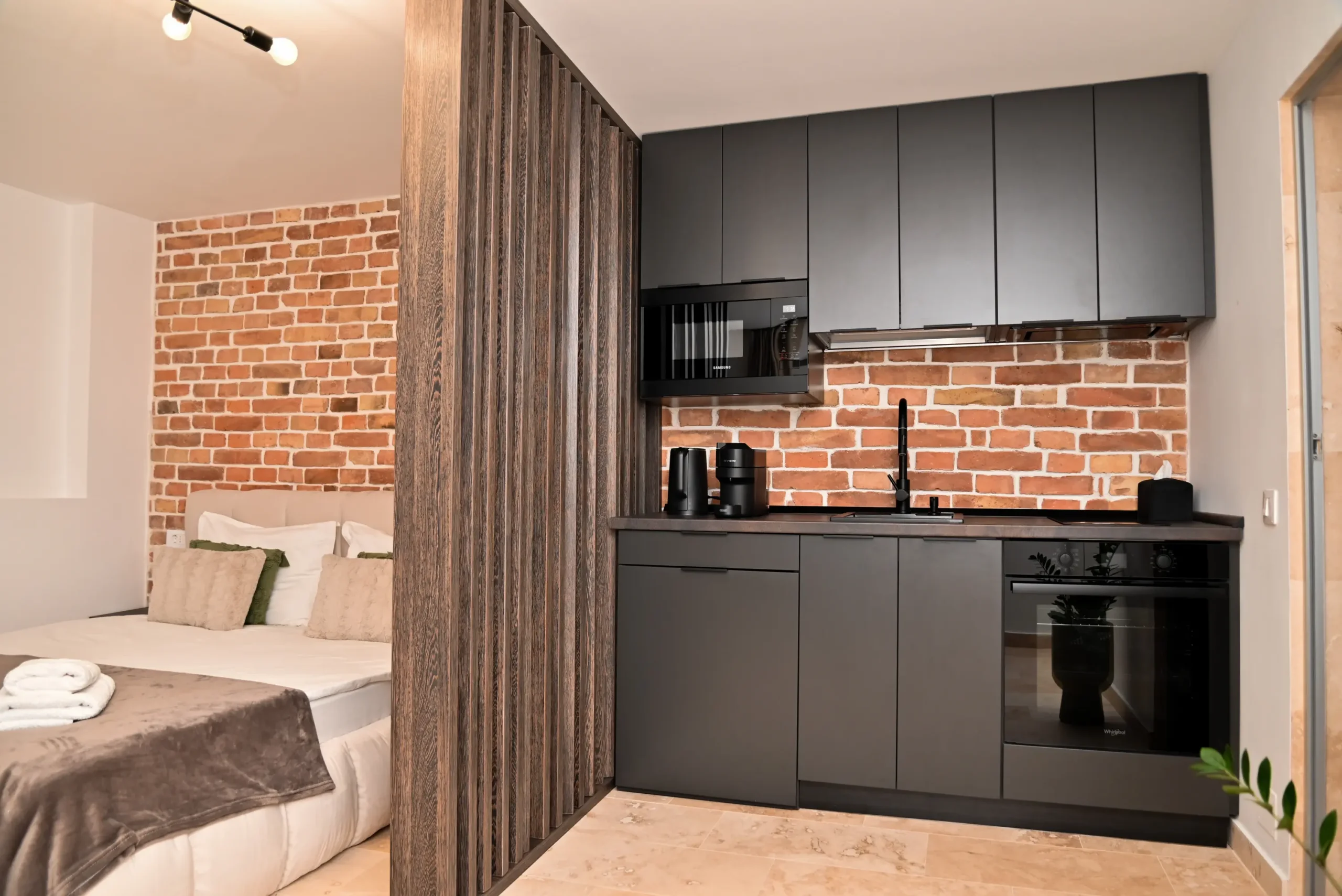 A modern 30 m² apartment featuring a separate bedroom, a fully equipped kitchenette, and a private bathroom with a walk-in shower. You can enjoy a terrace overlooking the inner courtyard, air conditioning, a washing machine, and a TV with streaming services. Perfect for a relaxing stay in Cluj, with all the amenities you need right at your fingertips.