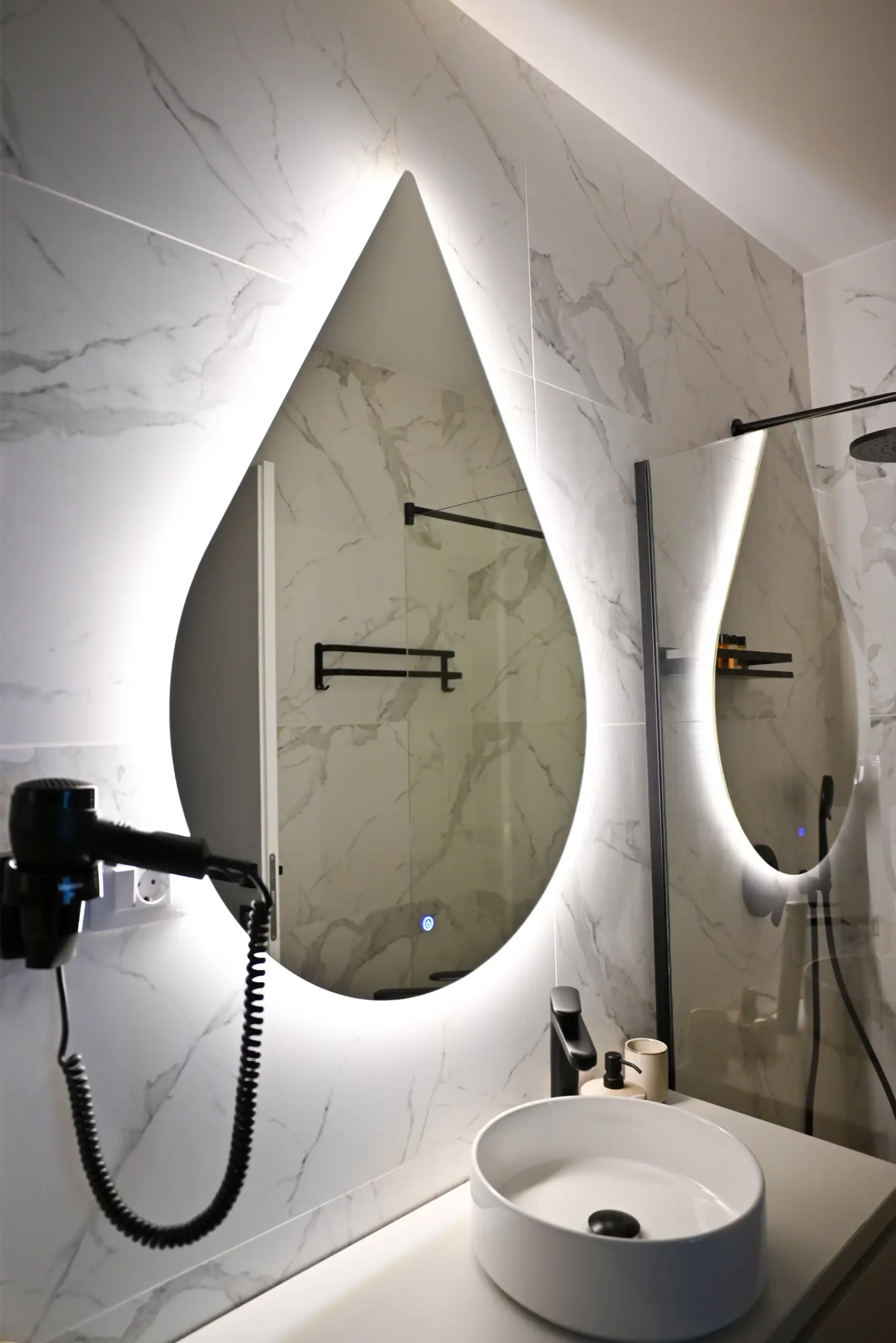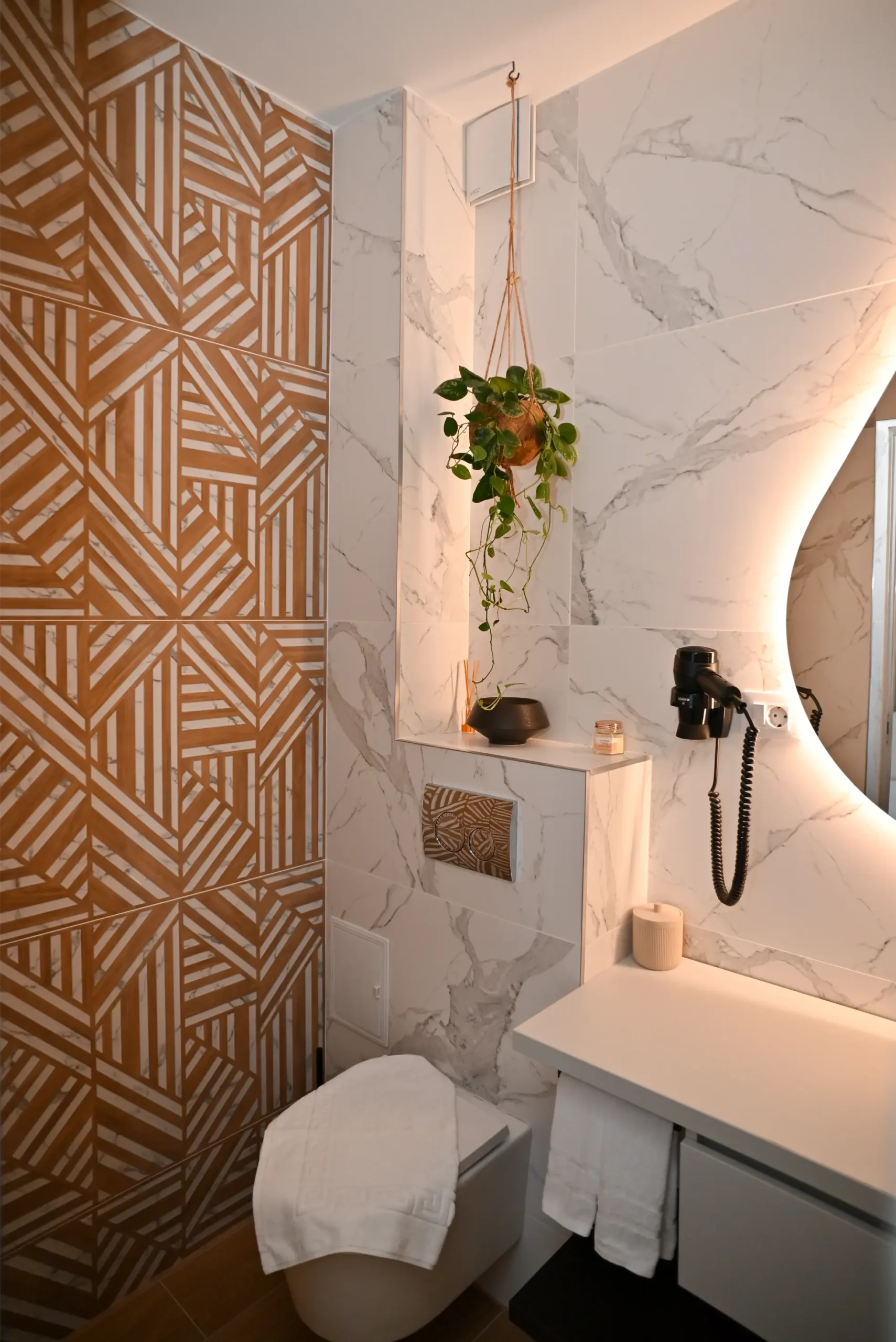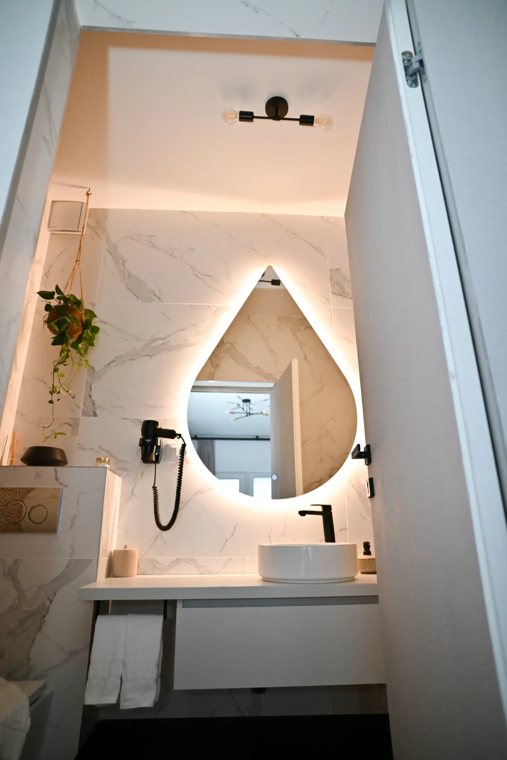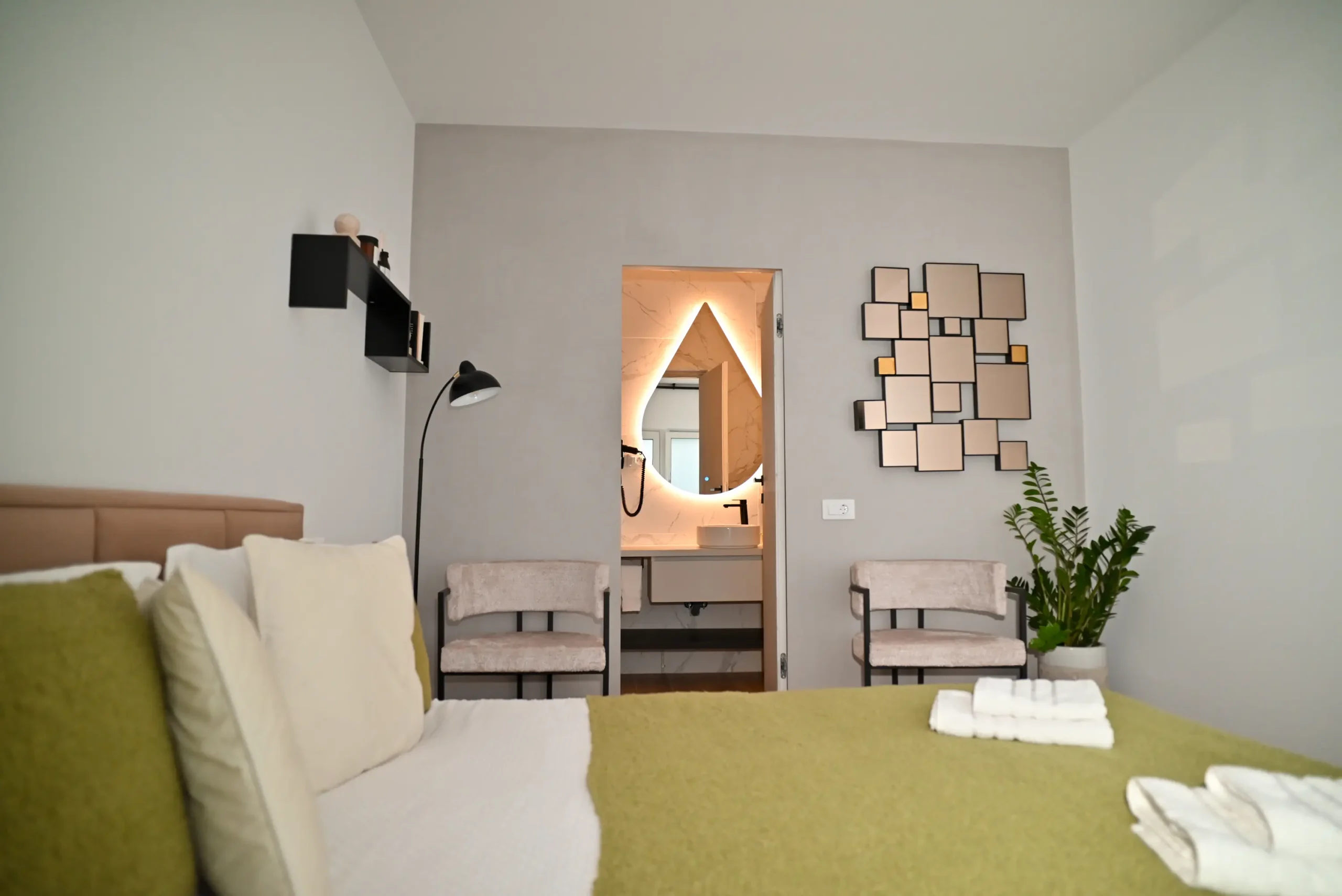 A modern and welcoming 18 m² double room featuring a private bathroom and a terrace overlooking the inner courtyard. Equipped with air conditioning, a minibar, a coffee machine, and a TV with streaming services, it’s the perfect choice for a comfortable and relaxing stay in Cluj.